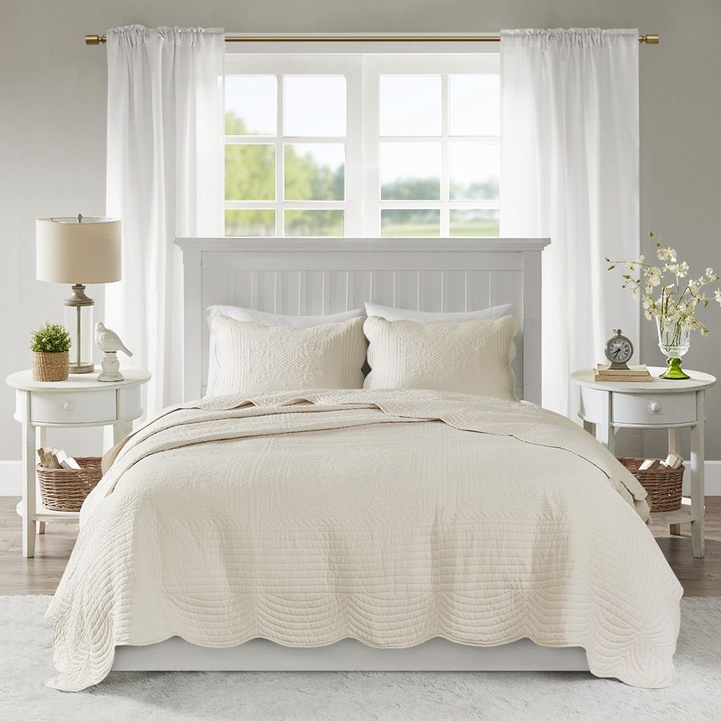 The Madison Park Tuscany 3 Piece Reversible Scalloped Edge Quilt Set is perfect as a layering piece or as an alternative to your comforter for a charming country look. The quilt and shams flaunt a classic stitch pattern with scalloped edges that add an elegant touch to your bedroom. This reversible quilt is filled with cotton filling and features a soft microfiber face, giving your bed a cozy cottage look. This farmhouse-inspired quilt also has an antimicrobial treatment that provides built-in freshness protection, reducing the growth of odor causing bacteria to keep fabric lasting longer.